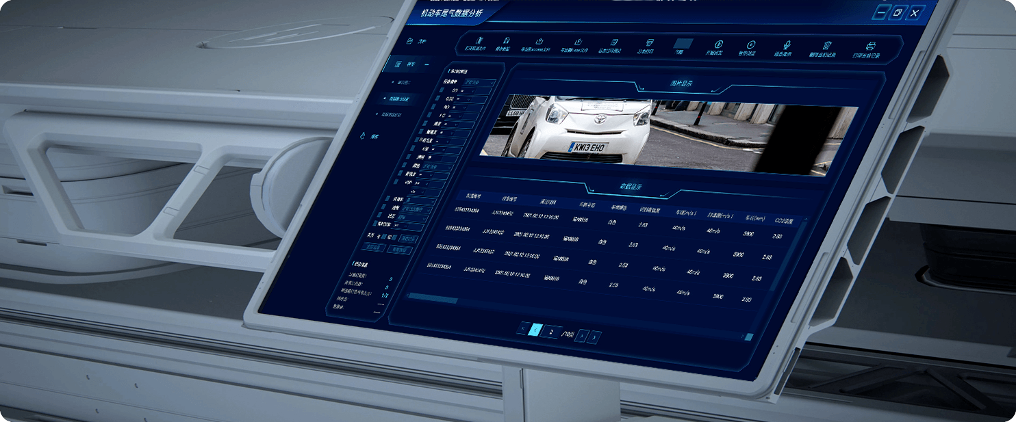 显示工具栏显示数据分析保存数据、导出文件、打印、删除、语音、浏览等工具按钮、通过车辆的车牌号、颜色、车速、加速度、车长、CO2等信息。